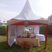 We transformed the garden into an elegant oasis with flowing drapes, styled tables, refined centerpieces, ambient lighting, and lush greenery accents, creating a serene, sophisticated atmosphere perfect for memorable celebrations.